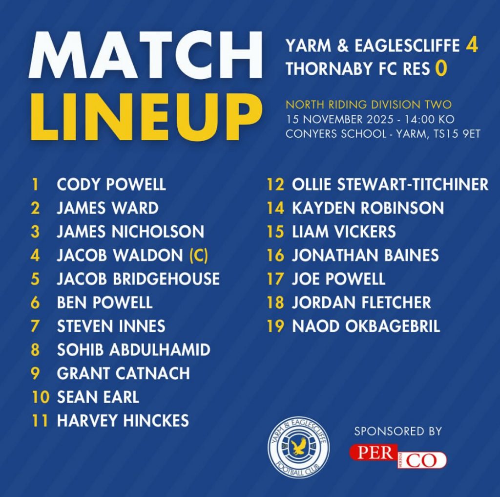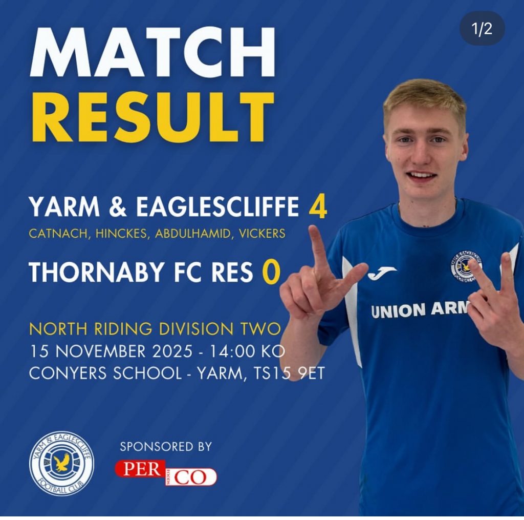 The Y&E U21 side got back to winning ways on Saturday with an impressive 4-0 win against Thornaby FC Reserves. The U21s went ahead on 12 minutes, with Grant Catnach continuing his Fien scoring form, tapping in after a powerful Steven Innes header rattled the cross bar. Grant engaged goal poacher mode and scored his 21st of the campaign so far. The U21s doubled their lead, with James Nicholson threading a lovely ball down the left wing, in to Harvey Hinckes who dribbled in to the box and was upended for a penalty. Harvey stepped up and took the spot kick, managing to sneak the ball underneath the keeper. Sohib Abdulhamid, scored his second in two games getting in to the box to put us 3-0 up at half time. Into the second half and the U21s were in dominant form, with shots raining in form all angles. The Thornaby keeper made some good stops and we had a few from distance that went over. Ollie Stewart Titchner, hit the bar. A foul on the edge of the box and up stepped Liam Vickers, curling a lovely free kick in to top corner. 4-0. Despite more chances, that’s how they game finished.