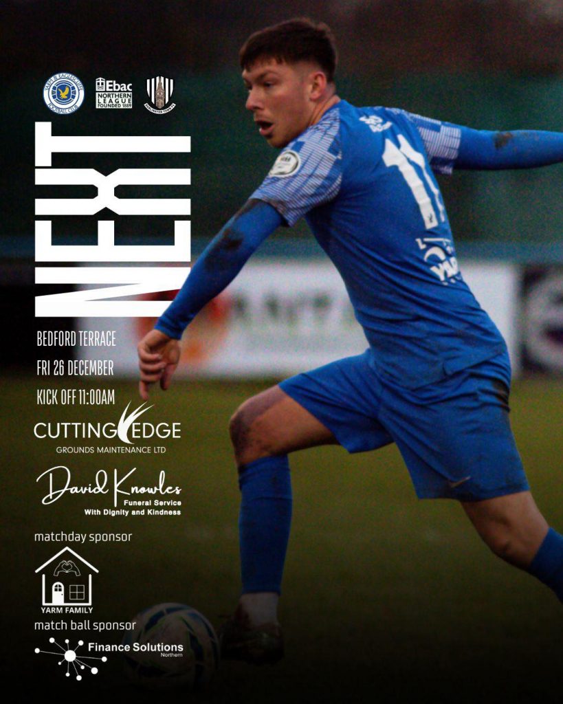 Next up for the Y&E is a Boxing Day home game vs Darlington Town. The match is kindly sponsored by the “Yarm Family” better known as Minty, Andy & Sully) and the matchball is sponsored by Finance Solutions Northern. Thank you all for your support – it is massively appreciated.